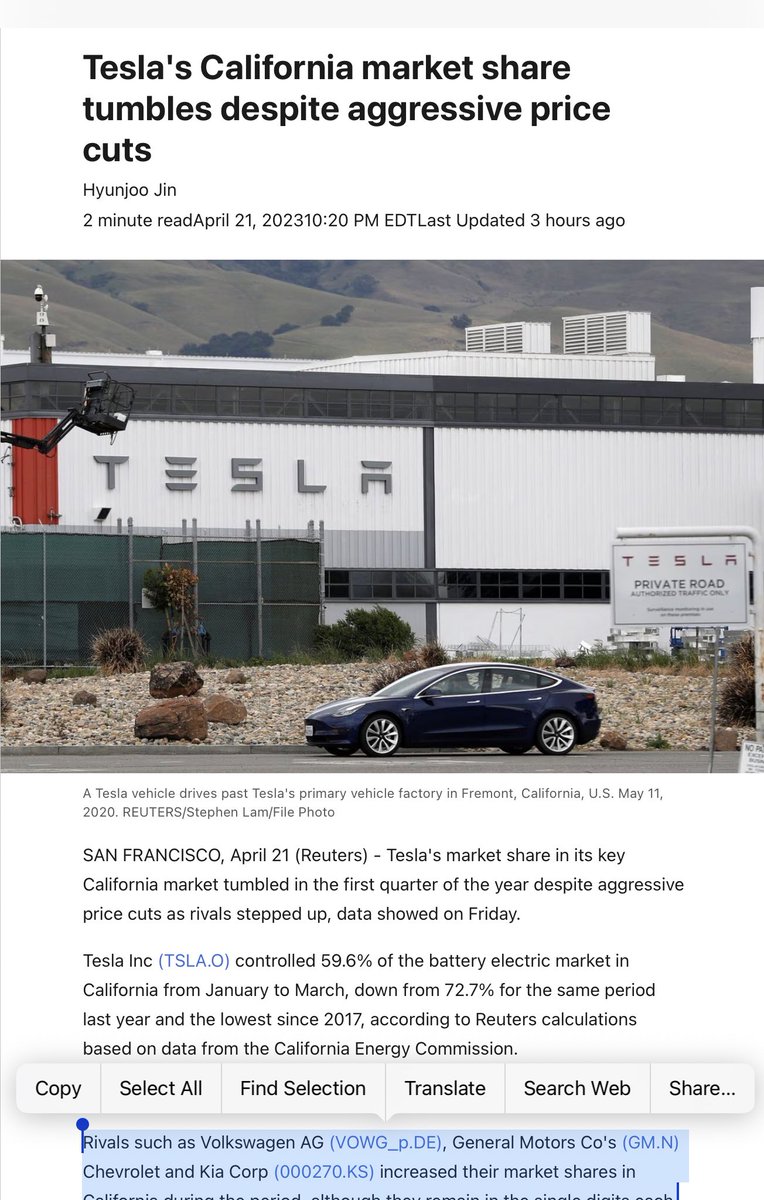 In 2022, ~1 in 5 Teslas sold were sold in California. Tesla’s market share in CA collapsed in 2023, while rivals Kia, Ford, GM etc increased their BEV share. Expect $TSLA stock to dive another 10% on this new data that emerged after markets closed on Friday. https://twitter.com/factschaser/status/1649645921095876610