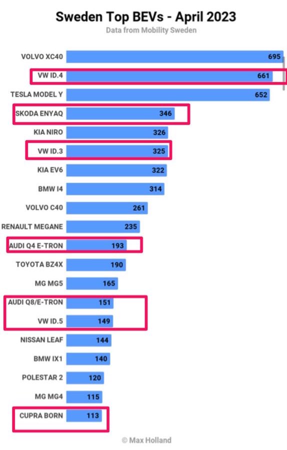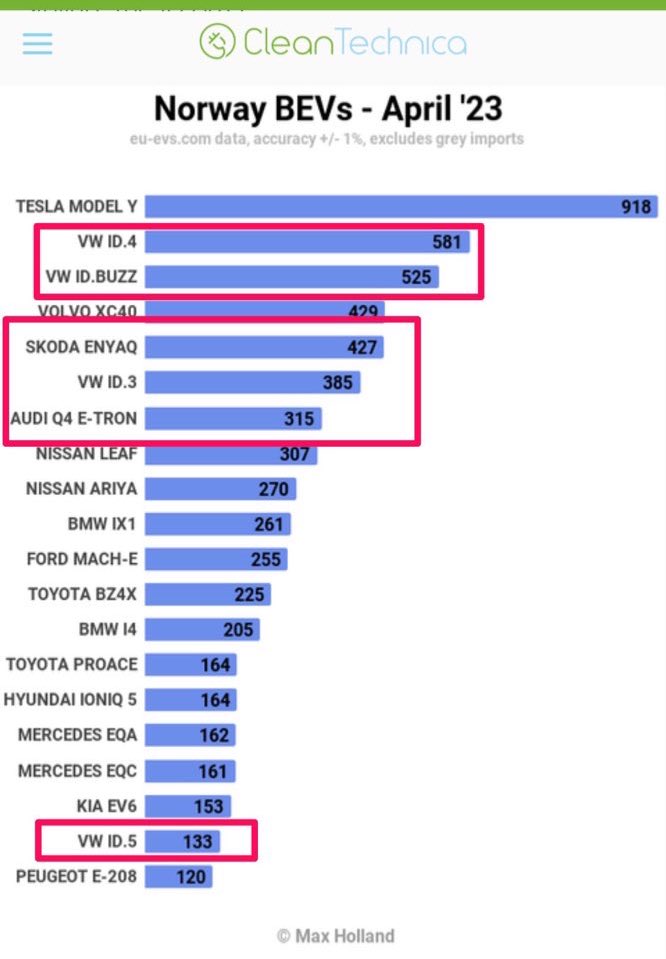 In Norway and Sweden, VW’s BEVs outsold Tesla 3:1 in April. Last year VW crushed Tesla in BEV sales (while making hybrids, PHEVs, regular Porsches, Bentleys, Lamborghinis, Audis etc). VW is all set to repeat its thumping of Tesla in 2023. https://twitter.com/factschaser/status/1654722654958387203