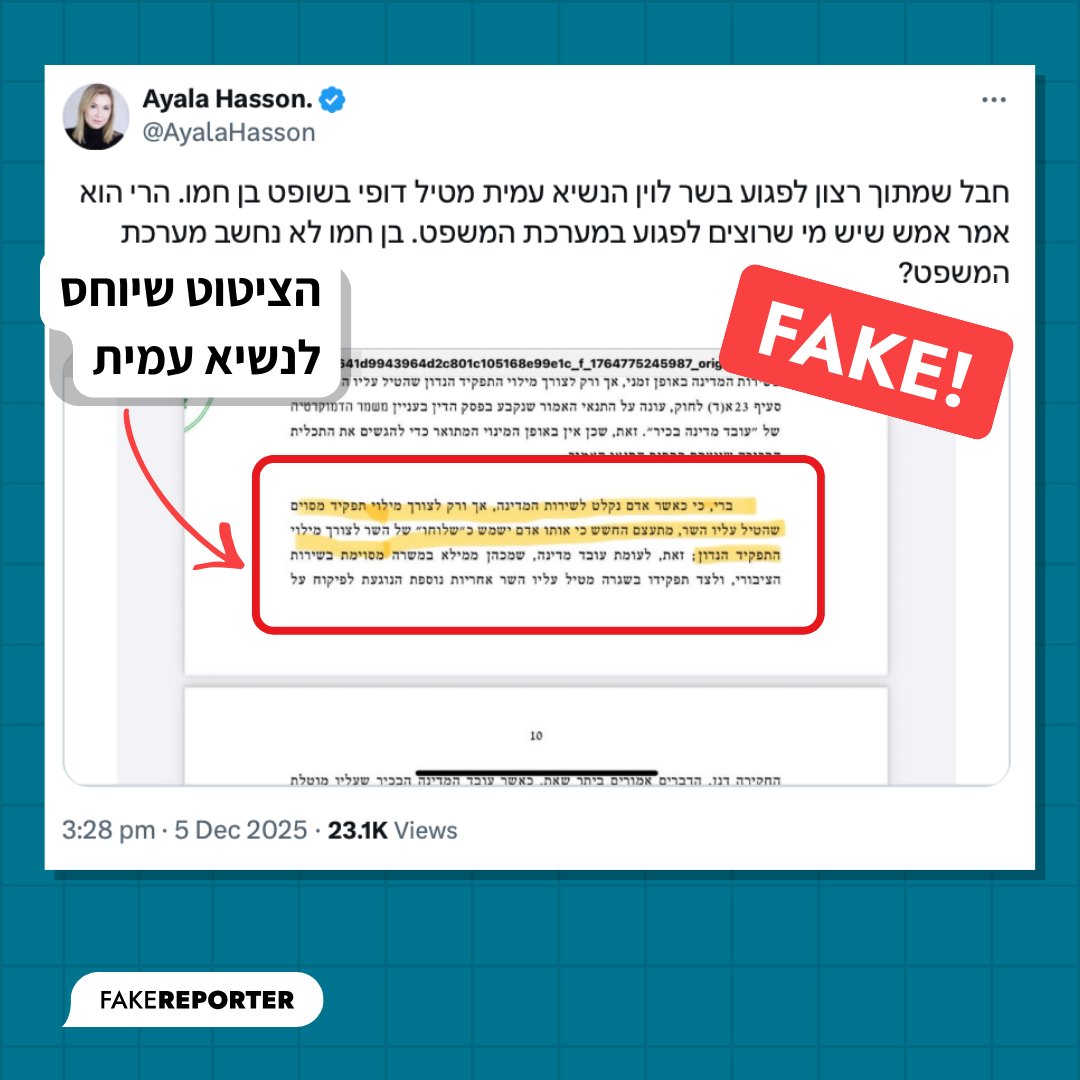 2. ב-5.12 נפל דבר: מגישת חדשות בשידור הציבורי פרסמה בחשבון שלה פייק מוחלט. לא אי-דיוק או מניפולציה, אלא בדיה מוחלטת. היא ייחסה ציטוט מפסיקת בג"ץ לנשיא עמית, כשבפועל כתבה אותו השופטת וילנר.