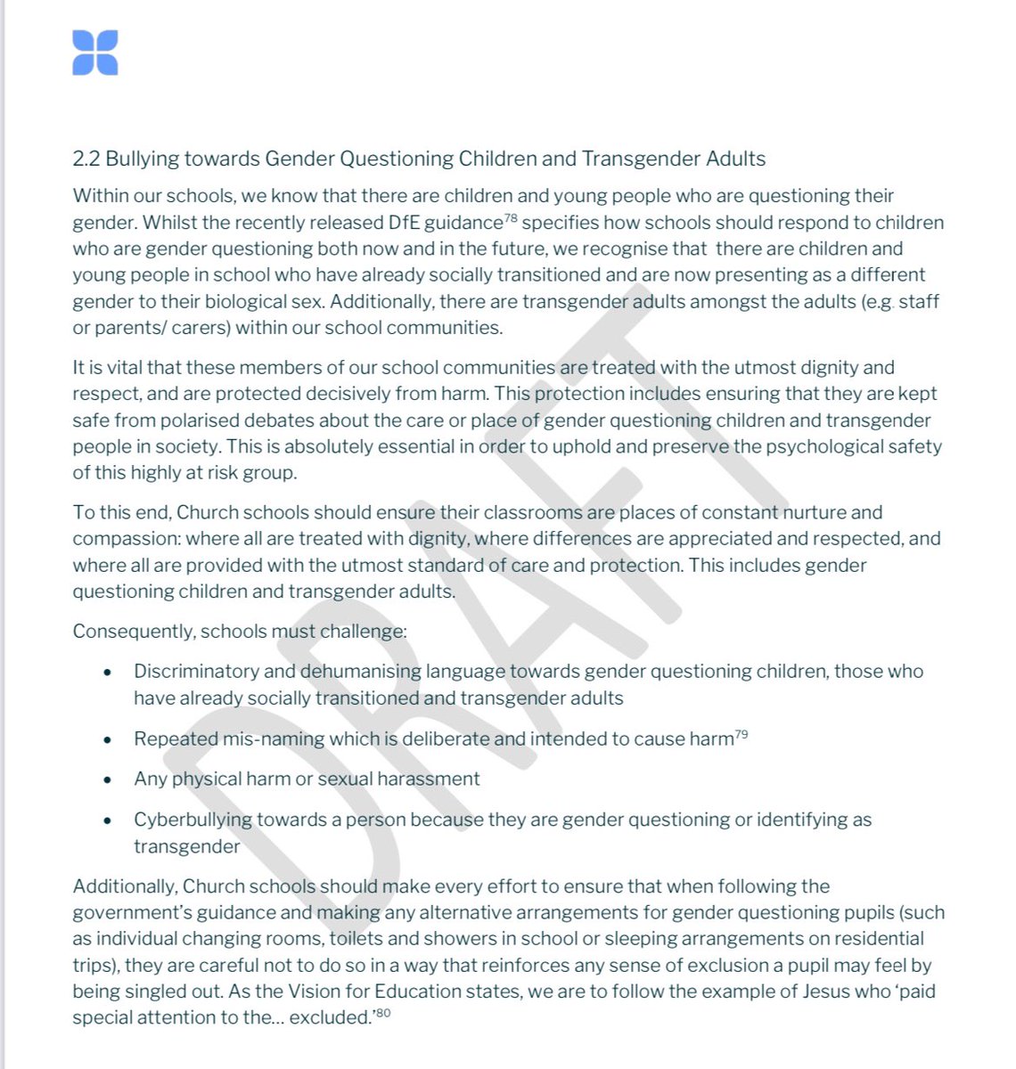 It says that LGBT children, young people and adults are ‘made in the image of God’ and that ‘gender questioning children and transgender adults are at the highest risk of being bullied at their schools.’
