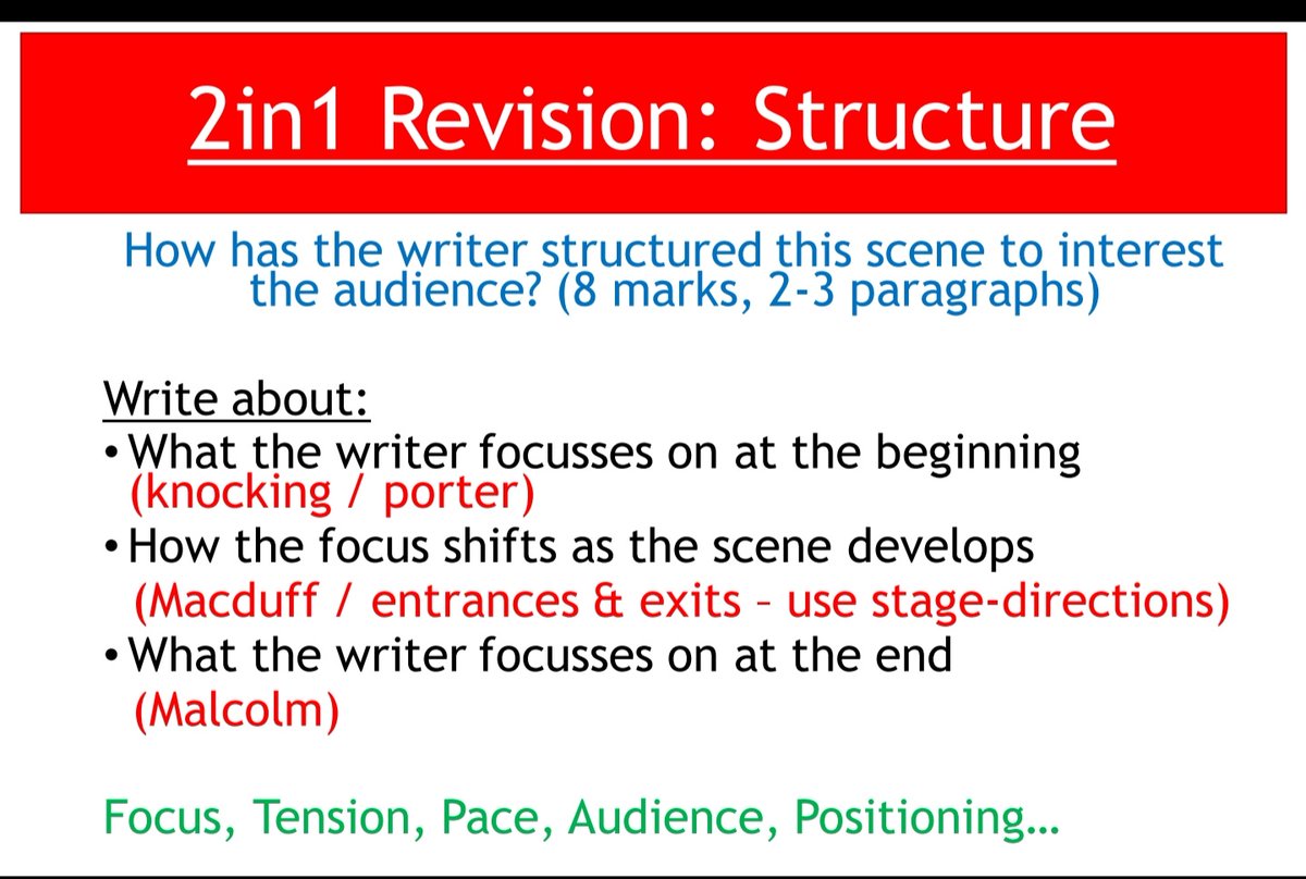Besides its overall cyclical structure and tragic arc, Macbeth is rich with stand-alone extracts that oscillate in focus, pace, tension and motifs - perfect for embedding structural analysis. A good example is Act 2.3 - the discovery of the regicide: 1/