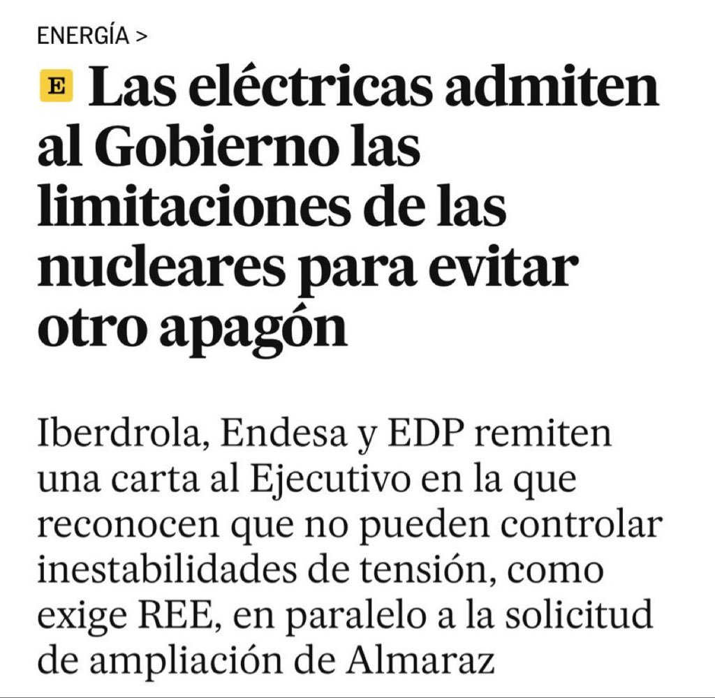 https://x.com/anadalbelda/status/19882340284539251412/X) Las nucleares estarán siempre presentes en el mix "Y A CONTINUACIÓN QUE VENGA TODA LA RENOVABLE QUE PUEDA".
