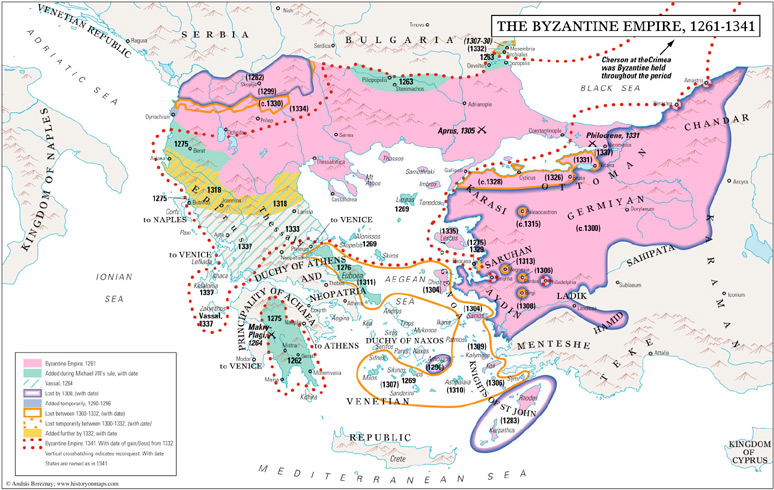 2. It begins with the restoration of Constantinople, which was was kind of an accident. Michael VIII had had sieged the city off and on since the battle of Pelagonia in 1259. But didn't have the troops to take it by storm, unlike the Ottomans two centuries later.