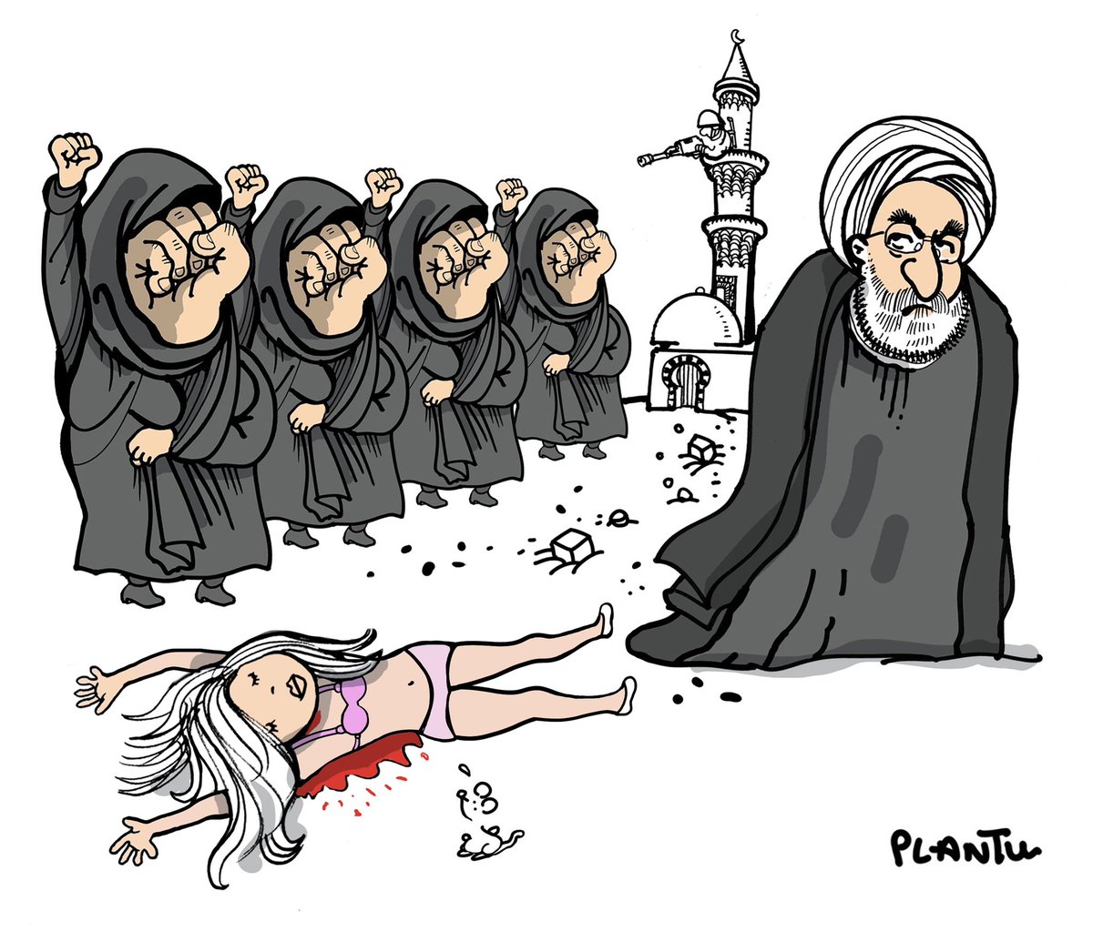 Donne col velo rappresentate come inumane o, nella migliore delle ipotesi, come vecchie, bisbetiche e brutte megere. Ahou Daryaei appare invece occidentalizzata, con tratti caucasici o addirittura bionda. 1/