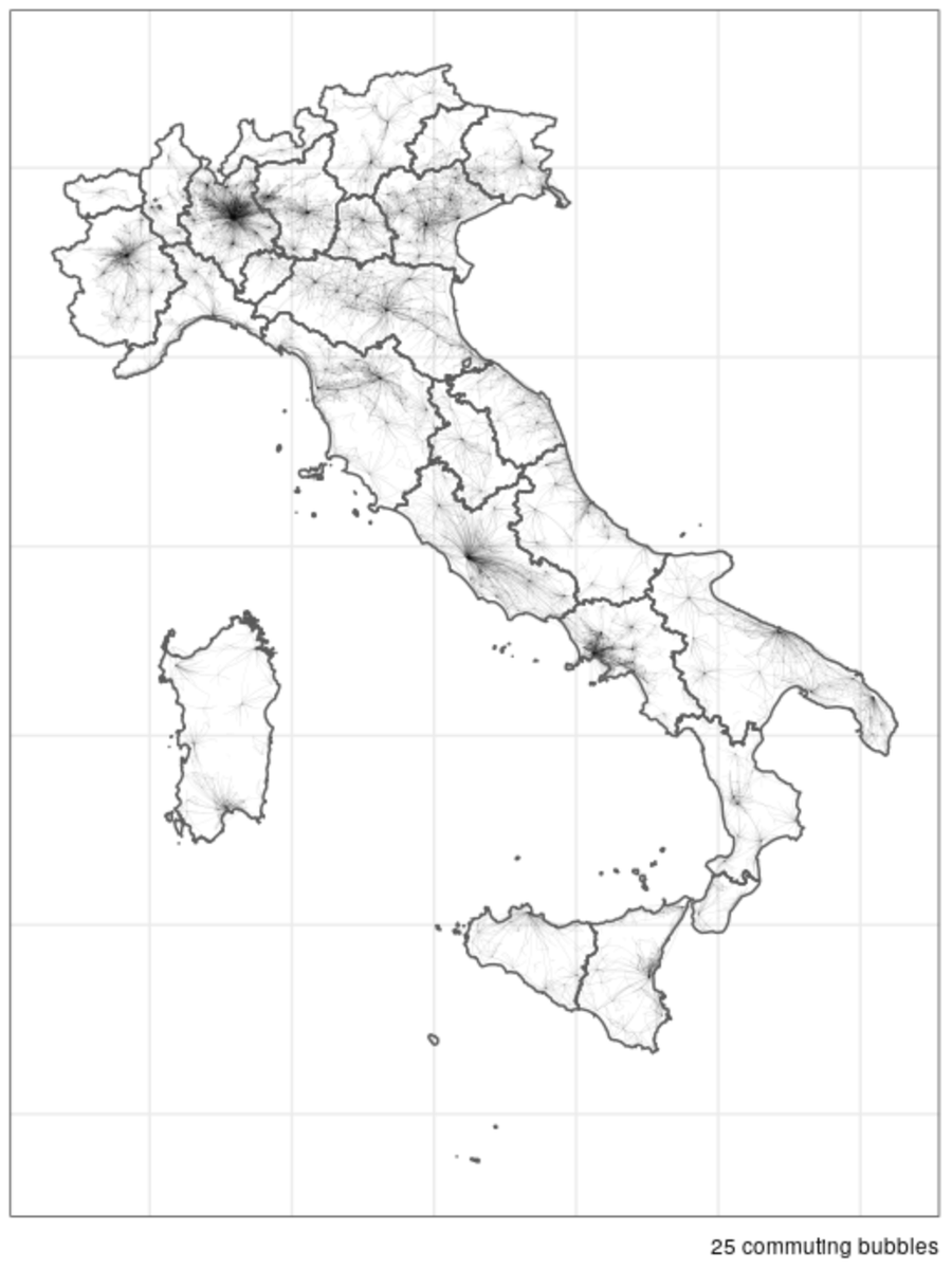Nell'immagine precedente si vedono i confini delle 20 regioni e i flussi di mobilità tra gli 8092 comuni italiani del 2011 (l'anno del censimento). Se consideriamo questi flussi come un network indiretto, possiamo usare un algoritmo per identificare eventuali comunità. Eccole.