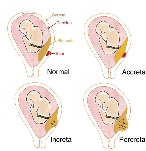4 major problems with placenta adhesion: previa, where it implants over the cervix; accreta, where it digs into the lining of the uterus; increta, where it goes all the way into the uterine muscle; and finally the worst, percreta, where it invades other abdominal structures