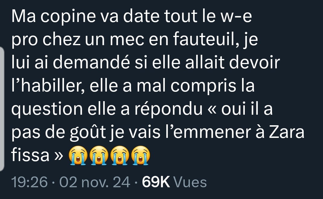 Je sais que beaucoup d'entre nous n'osent pas s'inscrire sur des sites de rencontre par exemple, parce-que les aides à la mobilité ça peut être un repoussoir. Ce tweet illustre ça très bien, la première pensée de l'autrice ce de savoir si il faudra habiller le mec.