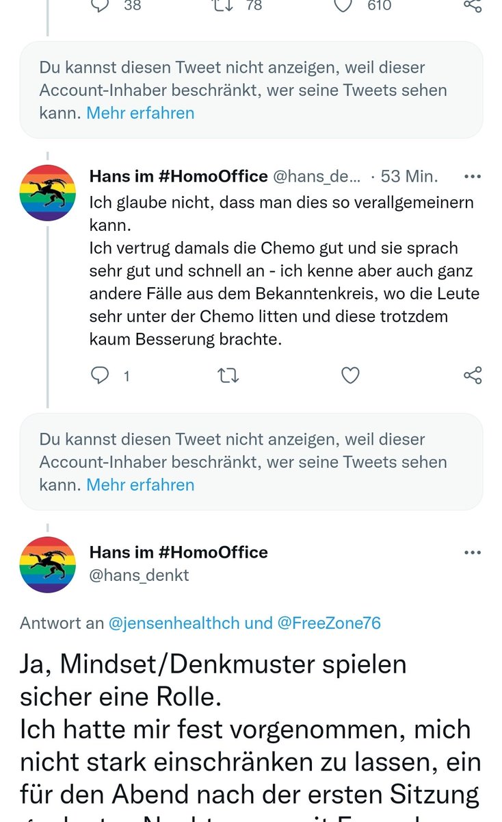 Ich erkenne so viele Parallelen zu meiner Erfahrung mit Krebs und anderen Krebskranken in der Reaktion der Menschen auf die Pandemie. Leute, der Virus ist der Feind, nicht die Massnahmen. Habe auch nicht die Chemotherapie zum Feind ernannt sondern den Krebs. Wichtiges Detail.