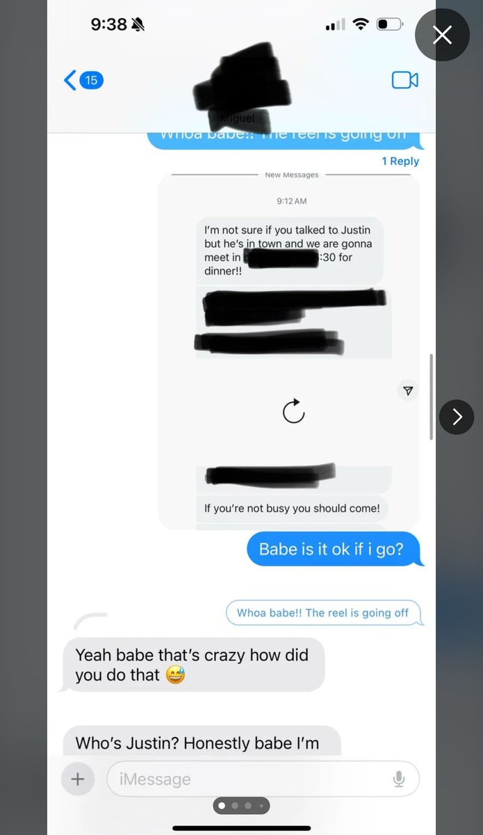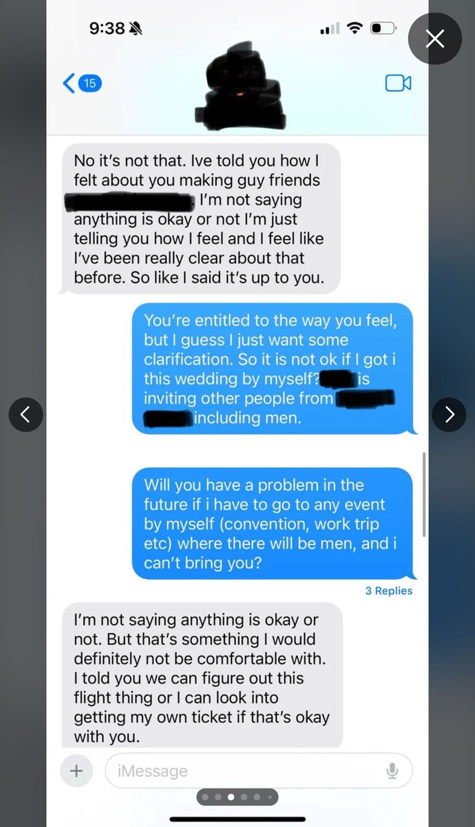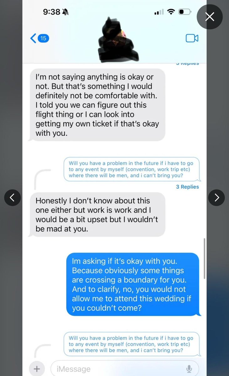 From the text exchange, you can see that the guy is weak. He is willing to bargain on things he said he was not comfortable with. If he had been confident about himself, he should have told her she was free to do what she wanted, as he had previously told her his stance. He is not holding back any burdens and leaves the choice to her to show she respects her commitment to him. She should listen to his preferences on some key matters. The fact that he has to even ask about "Justin" shows he is willing to compromise on his initial position.