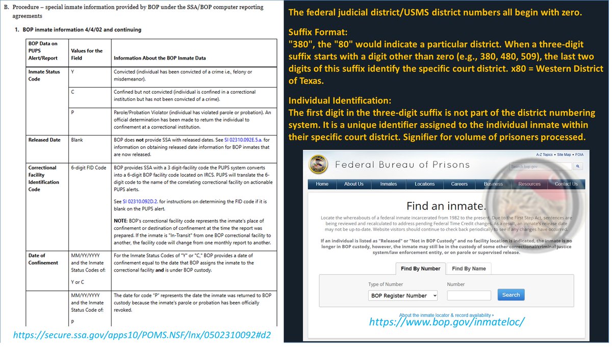 There are 98 districts and each facility is assigned to one of those districts. The last three digits of an inmate number identify the district where the prisoner was arrested and processed into the system. For example, 001 is the Northern District of Alabama, so an inmate's prison number would read xxxxx-001. Once that district has processed 100,000 people, the district designation would increase by 1... in this case, the last three digits would read as 101.