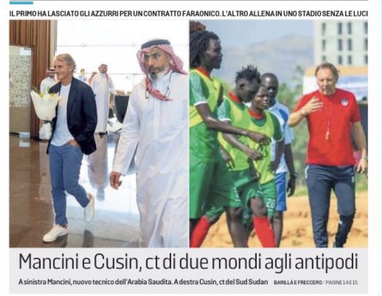 Oggi sul SecoloXIX c’è questo parallelismo. Pagina a sx conferenza di presentazione Mancini ct dell’Arabia, a dx intervista a Stefano Cusin ct del Sud Sudan. I 25 milioni all’anno e lo stadio senza luci. I soldi che comprano tutto e la vera passione del calcio …. 1/4