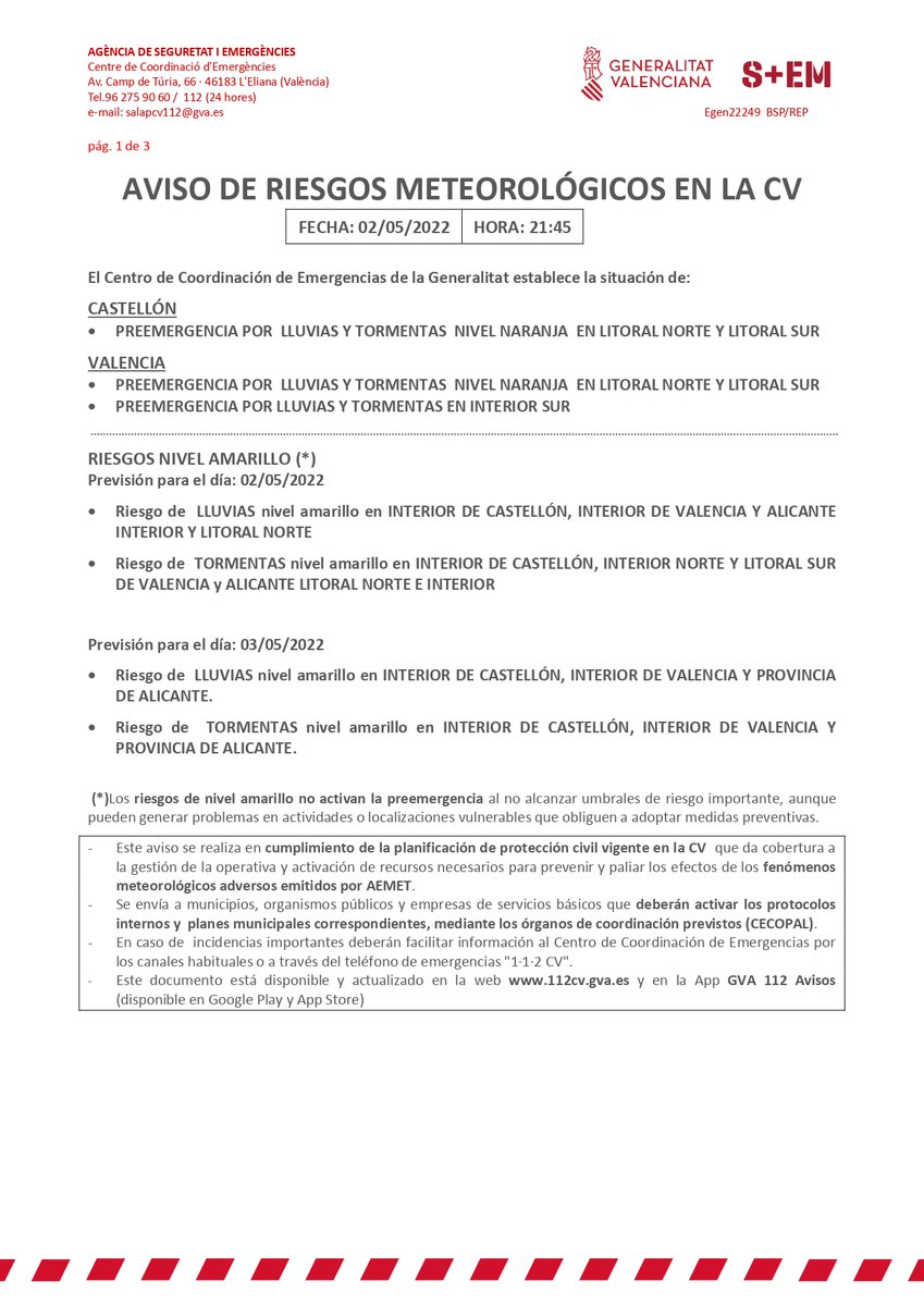 ⚠️El CEE de la @generalitat emite un boletín de riesgos meteorológicos: