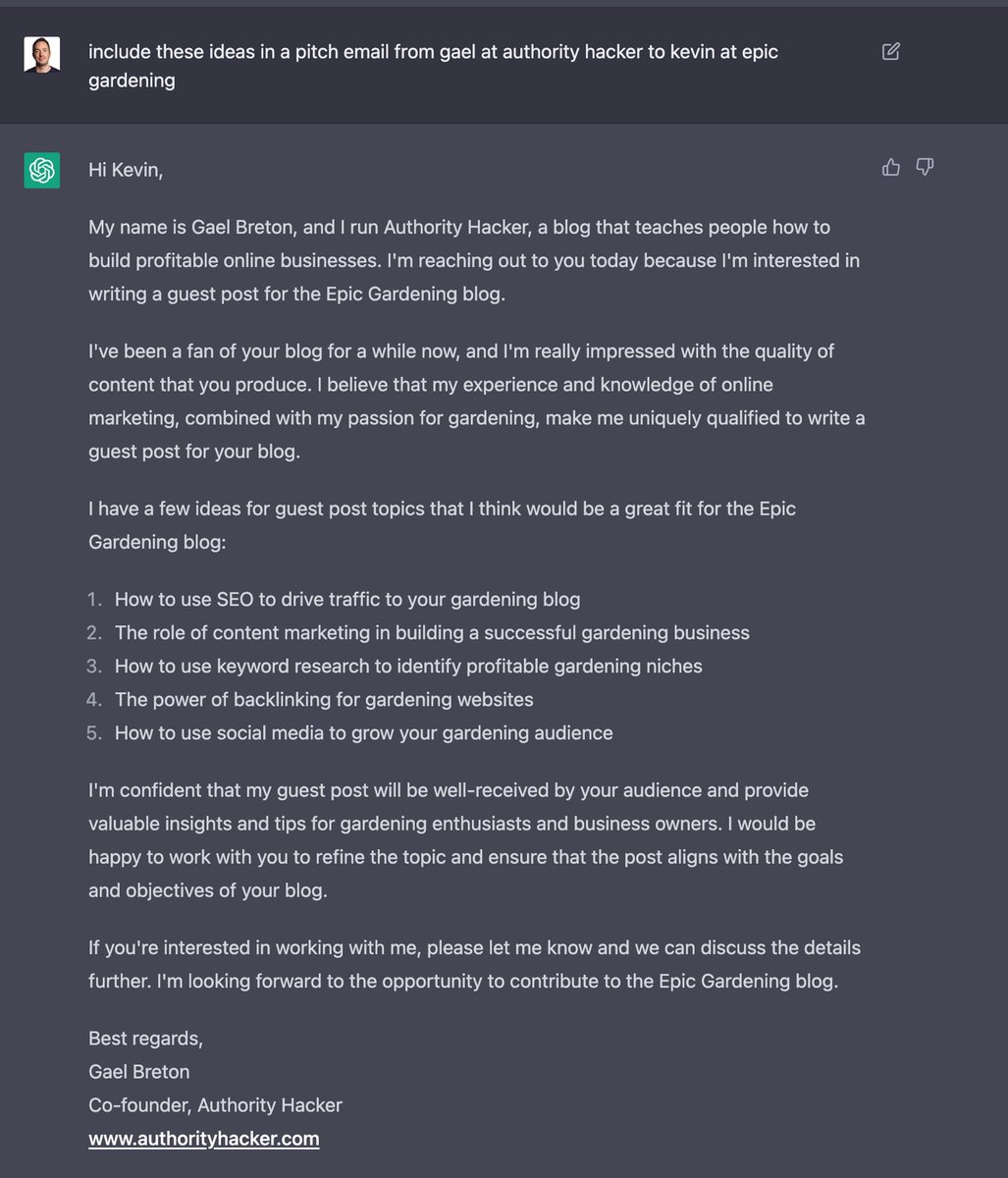 I then asked it to include the ideas in a pitch email from me to Kevin.