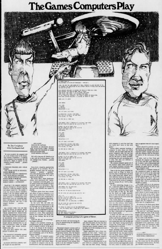 "Hi, I'm Mike Mayfield. I wrote the original Star Trek game during Summer of 1971. At least that's what I recall. I didn't put the program down until October of 1972, which you can find preserved here:"