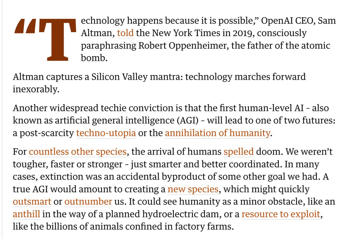 For instance, Sam Altman loves to invoke this idea, esp. when he's trying to compare himself to Oppenheimer. He's also said that AI could drive humanity extinct (he's stopped saying this as of late, but I think he still believes it). theguardian.com/commentisfree/…