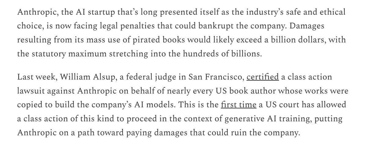 Bizarrely, no mainstream outlet had yet covered this possibility, so I wrote it up for Obsolete. A judge certified a class action representing up to 7 million copyright-protected books that Anthropic pirated.