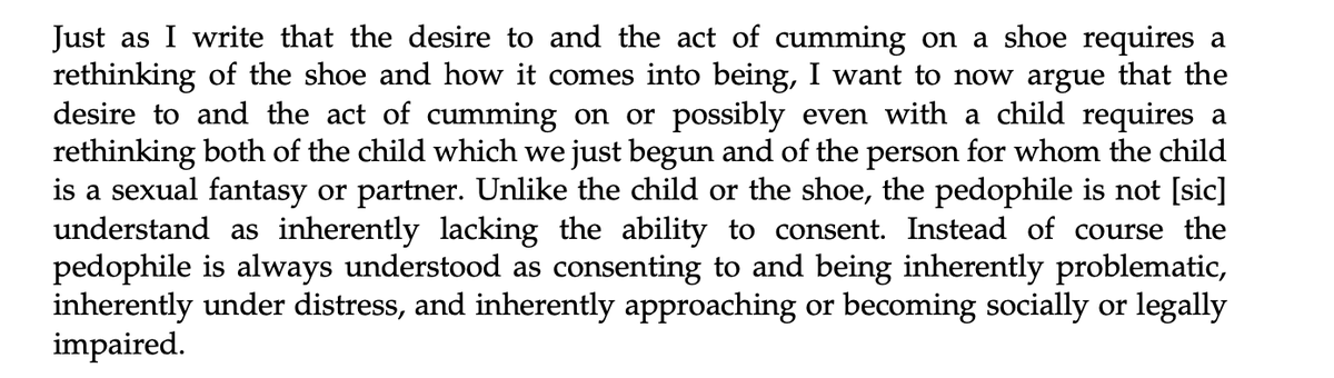 "So just as we must ask the shoe if it wants to be worn, we must enter a place epistemically in which we can ask the child if it wants to have sex. Again, the way in which we ask must not require an answer, or again at least not one which is conventionally intelligible or audible