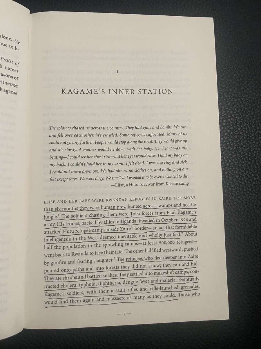 On page 7: ‘Kagame’s troops and his allies in Uganda invaded in Oct 1996 and attacked Hutu refugee camps inside Zaire’s border an act that formidable intelligentsia in the west deemed inevitable and wholly justified ‘