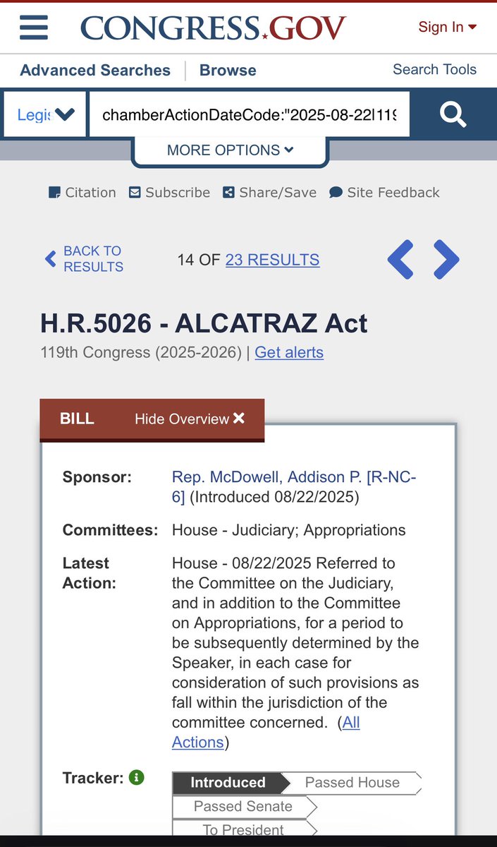 AIPAC Rep. Addison McDowell just introduced H.R. 5026 ALCATRAZ Act (8/22/25) which requires an established plan coordinated with states to: