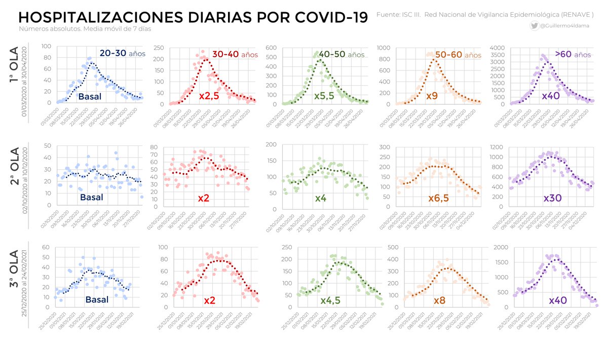 El verdadero impacto de una pandemia se calibra por la cantidad de hospitalizados y muertos. En la figura les dejo un resumen de las tres olas que hemos sufrido (de momento).
