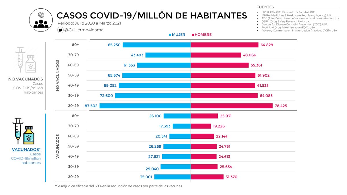 Para evaluar cualquier tratamiento, hay que sopesar riesgos y beneficios. En España los estratos con + contagios por COVID son los jóvenes (especialmente mujeres). Por tanto, serían en teoría los + beneficiados de la vacunación. Entonces por qué estamos vacunando a los mayores?