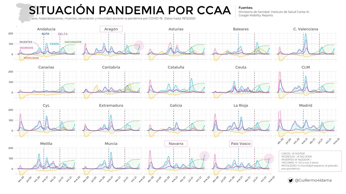 Les muestro la situación por CCAA. La buena noticia es que aunque en todas suben los contagios, gracias a la vacunación las muertes y hospitalizaciones ni crecen tanto ni lo hacen tan rápido, algo muy importante para evitar la sobrecarga hospitalaria.