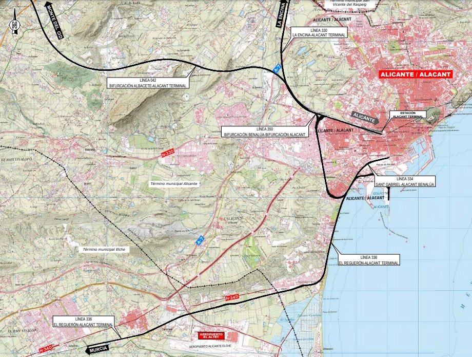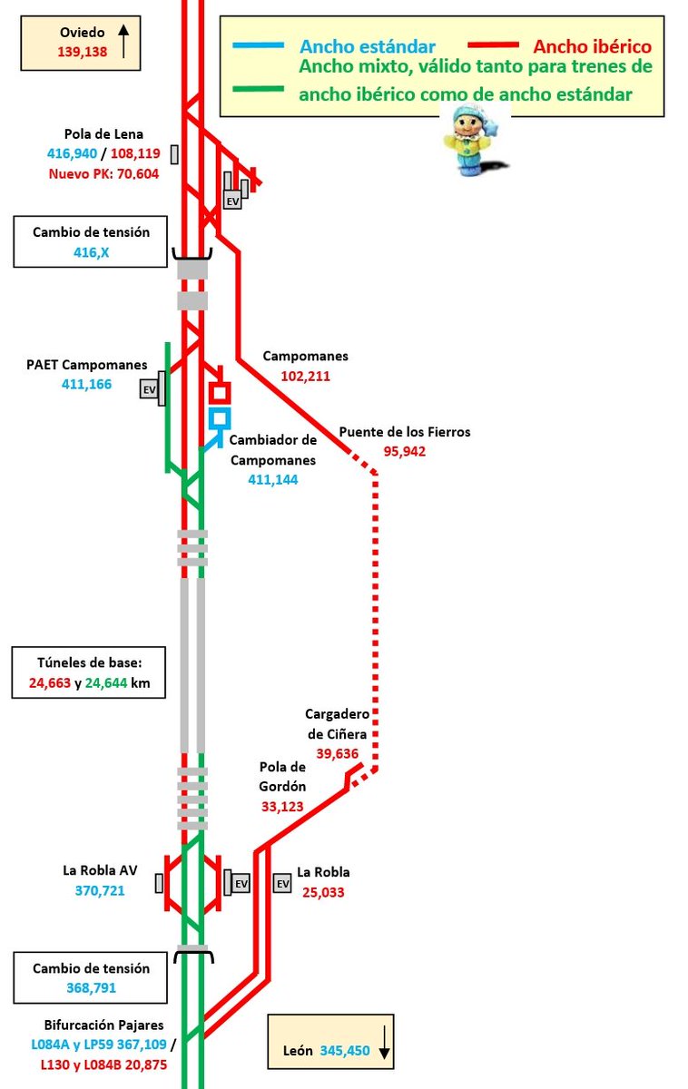 2⃣ Pese a que las traviesas son polivalentes (en rojo, ahora ancho ibérico y después estándar) o para ancho mixto (en verde, ambos anchos a la vez mediante 3 carriles), la línea entrará en servicio en 2023 solo para ancho ibérico, ya que el ancho mixto no estará hasta 2024