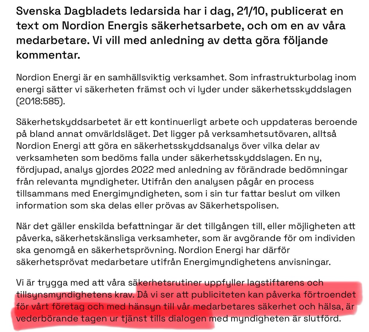 Sveriges nuvarande chef för energisäkerheten, han som lät Extinction Rebellion ansvara för gasinfrastrukturens säkerhet, får gå till en annan myndighet. Men istället för att göra en öppen rekrytering ger man nu hans tjänst till @Energi_mynd:s adminchef.https://twitter.com/ledarsidorna_se/status/1891388952650957002På RK-mötet ville @Energi_mynd:s analyschef tona ner problemet, och hävdade att fällningskemikalerna kunde importeras från Kina istället. Jag blev tvungen att protestera. Det kunde nämligen inte få finnas några illusioner om att Sverige kunde klara sig utan den egna produktionen.