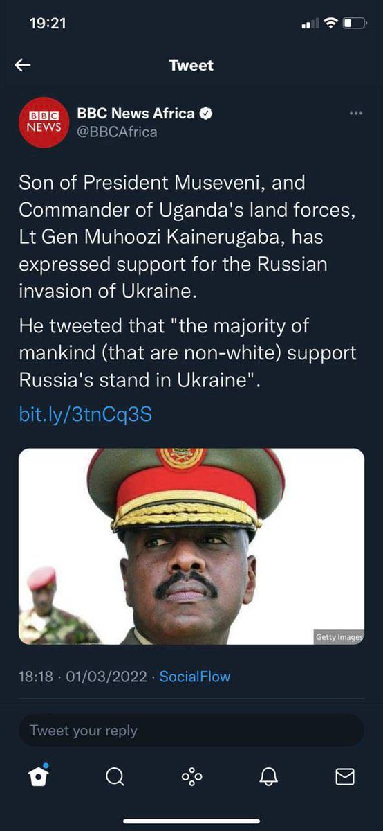 From personally overseeing the torture of hundreds of our supporters, to murdering civilians in the DRC and other places, Muhoozi is now praising the invasion of Ukraine! Why wouldn't he? The same group invaded & looted DRC. We now have to pay millions of dollars in reparations!