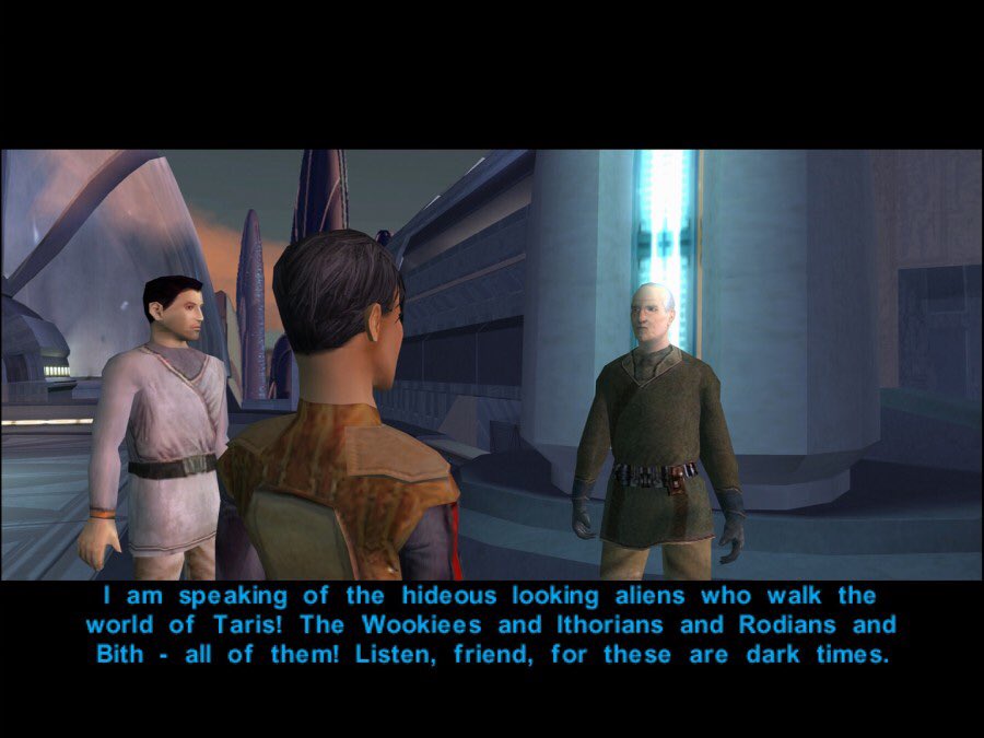 Narration: Our first stop is Taris. And fairly early on, we meet this meatbag, whining about how these damned aliens are ruining the city. Tell me, which party is worried about “aliens” migrating into these United States? Also extends to every other bigotry.