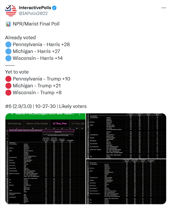 הם גם מוסיפים נתוני אמת של המדינות ממה שקרה עד כה - אז ככה בפנסילבניה האריס הצלחיה לבנות חוכמה כחולה של 28%+ ומהקולות שנותרו יש לטראמפ 10 יתרון במישיגן היתרון הוא 27% בקרב הנותרים לטראמפ 21% ויסקונסין להאריס 14% יתרון מקרב הקולות הנותירם לטראמפ יש יתרון של 8% שימו לב אלו>>