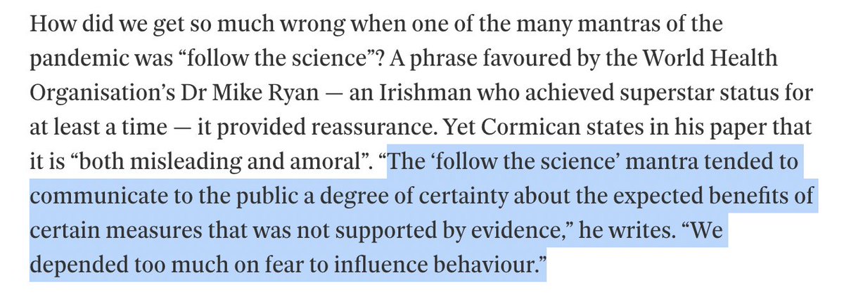 "De 'follow the science'-mantra had de neiging om het publiek een zekere mate van zekerheid te geven over de verwachte voordelen van bepaalde maatregelen waarvoor het bewijs ontbrak', schrijft hij. "We waren te veel afhankelijk van angst om gedrag te beïnvloeden"