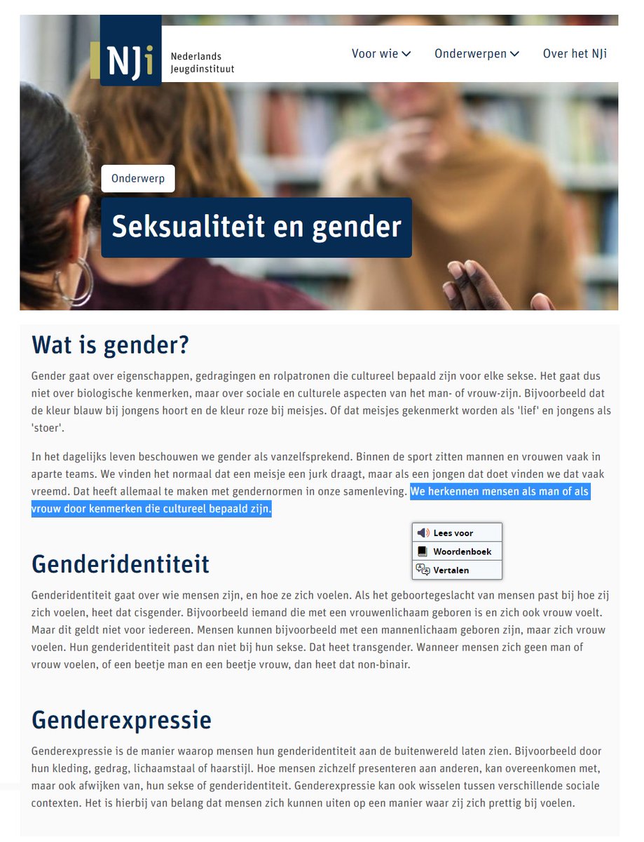 "We herkennen mensen als man of vrouw door kenmerken die cultureel bepaald zijn". Is dit wat kinderen voorgeschoteld moeten krijgen? Werkelijk?