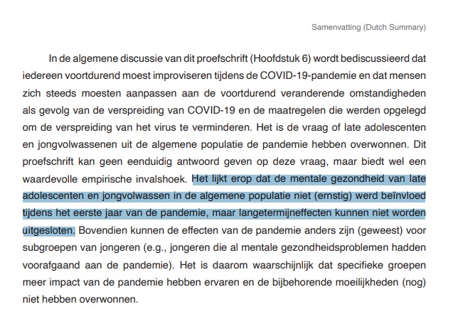 Heeft de wetenschapsjournalist van De Volkskrant het proefschrift wel gelezen? Zijn conclusie 'geen effect van de coronacrisis' is uit de lucht gegrepen. Onderzoekster Naomi Koning schrijft nota bene zelf dat het onderzoek het EERSTE jaar van de coronapandemie betreft.