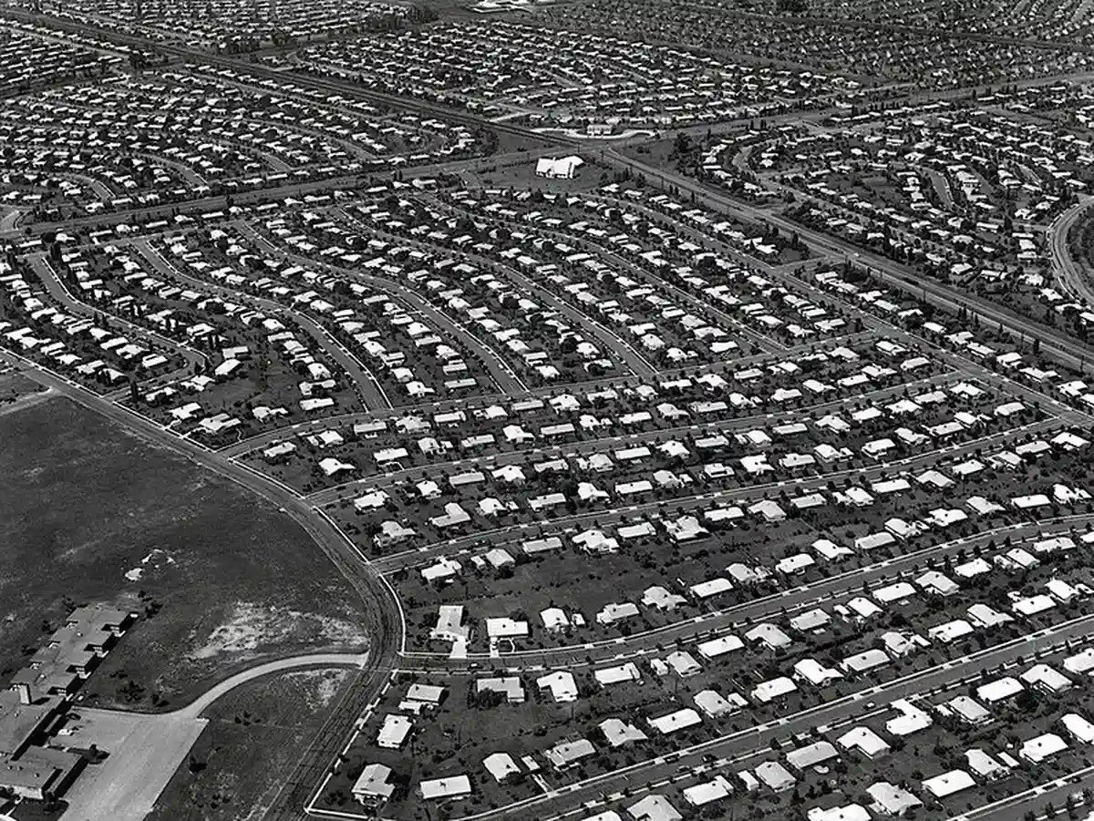 1945, WWII had just ended, and millions of soldiers returned home. America faced a massive housing crisis, cheap, mass produced homes on farmland outside cities became the solution. Between 1945 and 1960, 13 million new homes were built in the U.S.
