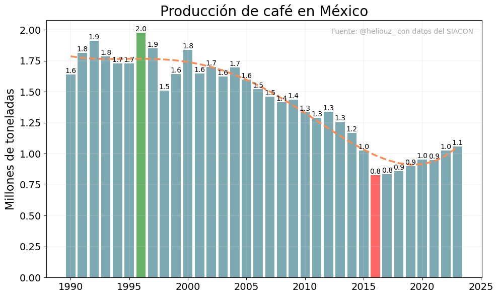 En méxico la producción de café llego a su mínimo histórico en el 2016 con una producción de 0.824 millones de toneladas. Eso es menos de la mitad de lo que se produjo en 1996, cuando producimos casi 2 millones de toneladas.