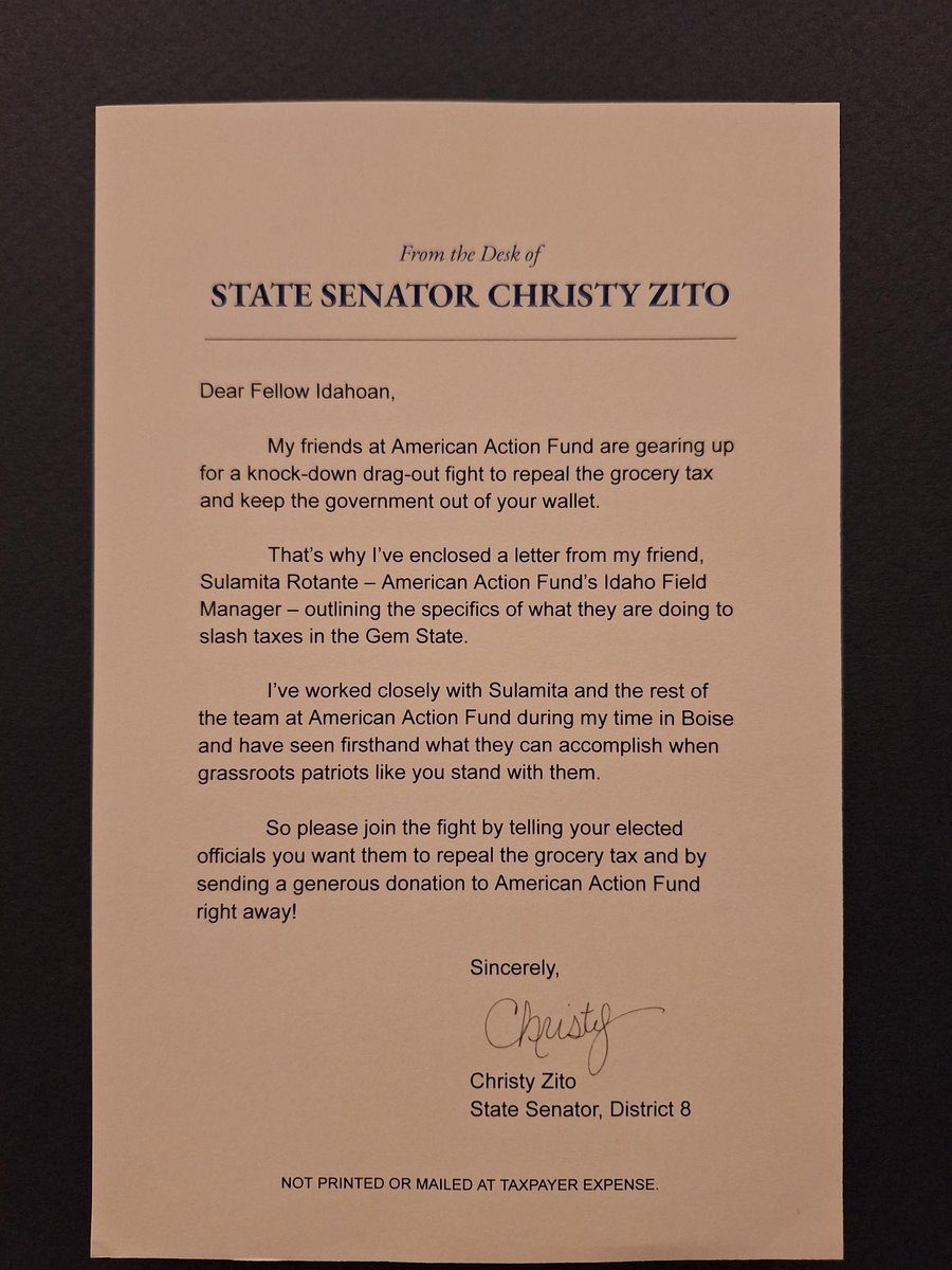 1/ Did Idaho’s senator Christy Zito sell her name to an out-of-state PAC (and an Idaho registered lobbyist) called American Action Fund, run by Young Americans for Liberty, the Texas based pro-drug legalization group to help them fundraise off of Idaho’s voters? #idleg #idpol 2/ This fundraising packet went to many Idaho households in the mail. In it they are claiming that they want to help Idaho eliminate the grocery sales tax, so please make a generous donation to them.