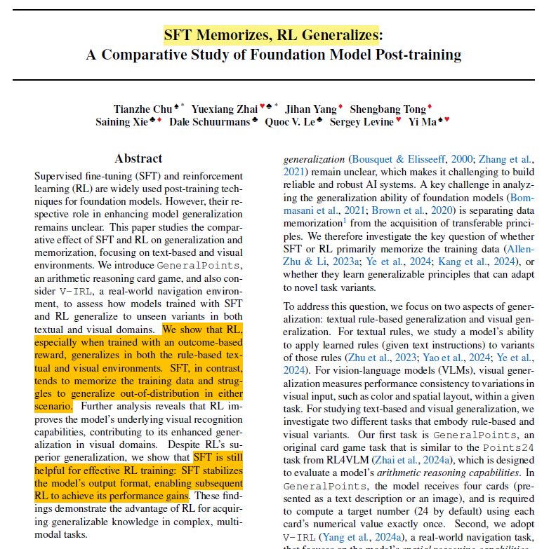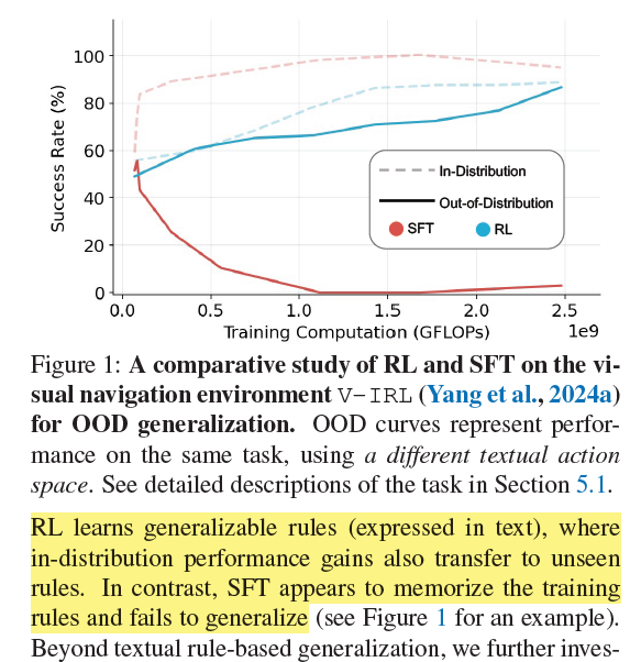 In short, the paper argues that supervised fine-tuning (SFT) helps the model memorize and align with certain outputs, while reinforcement learning (RL) helps the model generalize and learn out-of-distribution (OOD) tasks.