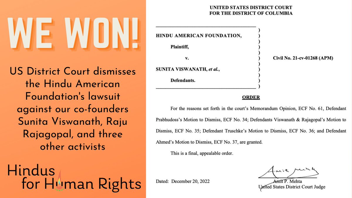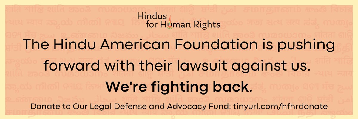 In May 2021, @HinduAmerican filed a lawsuit against HfHR's co-founders, @SunitaSunitaV and Raju Rajagopal, and 3 other defendants (@rasheedahmedusa, @john_prabhudoss, and @AudreyTruschke) with baseless accusations of "defamation and conspiracy to defame" HAF.
