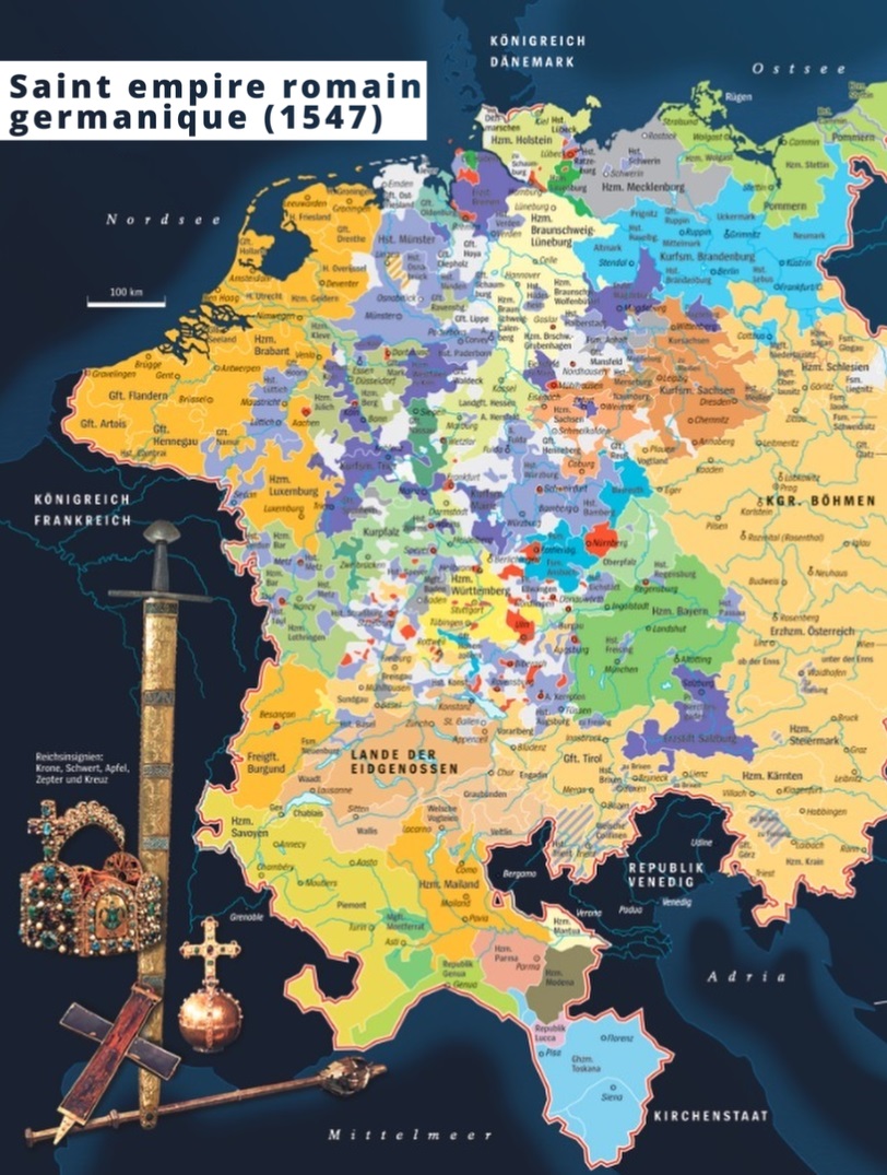 Empire fragmenté, composé de centaines de duchés, de comtés, de villes libres et d'autres principautés ; il s'agit d'un casse-tête juridique et territorial.