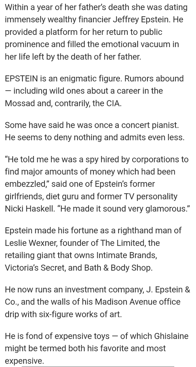 A New York Post puff piece on Ghislaine Maxwell from March 2000 notes that Jeffrey Epstein "is an enigmatic figure. Rumors abound - including wild ones about a career in the Mossad and, contrarily, the CIA"