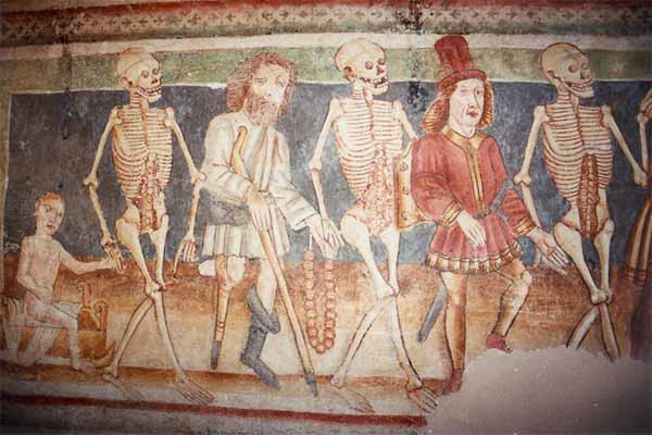In the church of innocence in Paris so many newly dead sought admission that old bodies were exhumed as soon as the flesh was expected to have fallen off the bones. The bones piled indiscriminately in charnel houses that became social hubs for merchants & prostitutes. (1509)