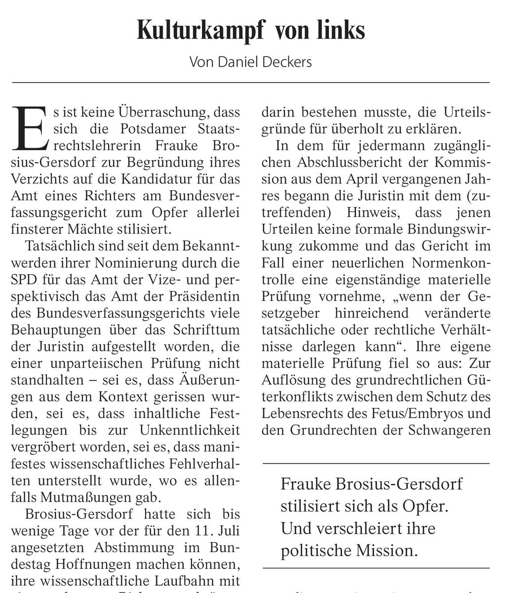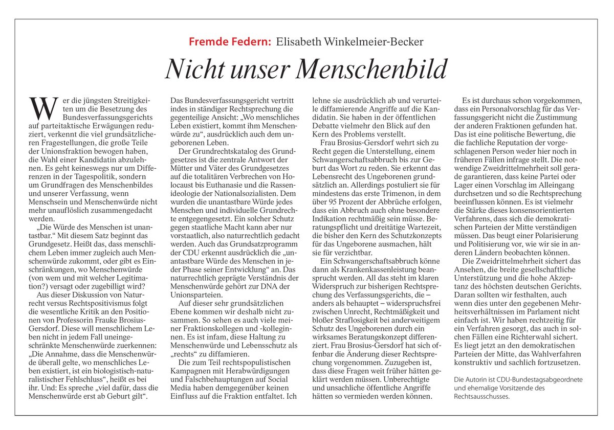1/Dobrindt, Söder - die Liste der Männer, die Frauke Brosius-Gersdorf bescheinigen, für sie nicht wählbar zu sein (seit wann eigentlich?), wird nun um Elisabeth Winkelmeier-Becker (CDU, MdB) erweitert, die das demagogischste aller Worte heute in der FAZ vertritt: Wer anders als