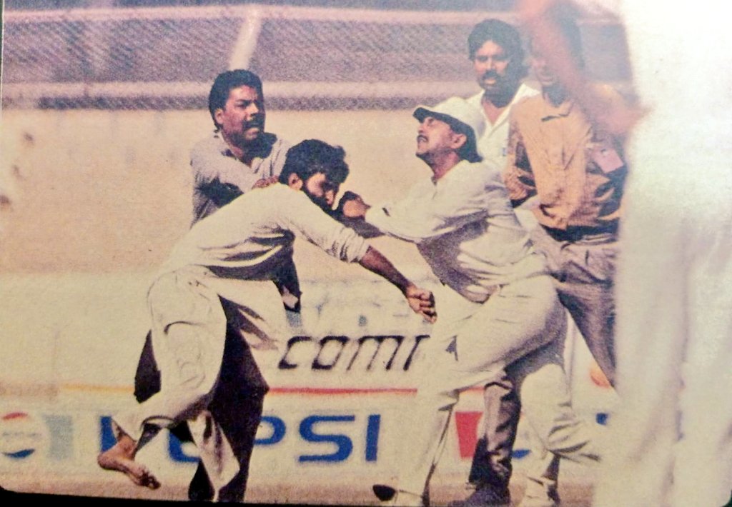 1. A Pakistani fan attacked Indian captain Kris Srikkanth during a match in Karachi despite full security.2. Pakistani fans pelted stones on Indian Players despite full security. Javed Miandad with on of the stone.