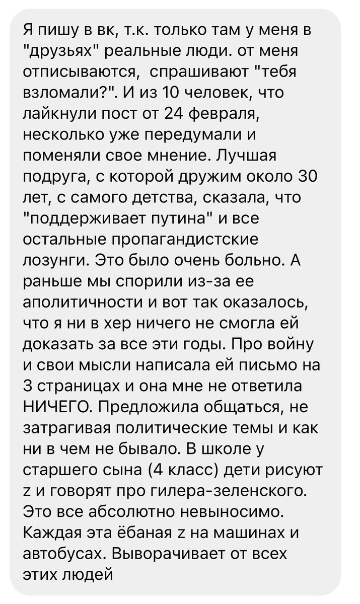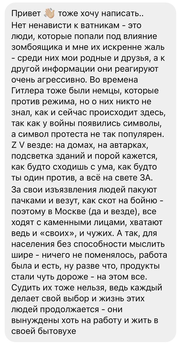 Вчера предложила своим подписчикам в Инстаграме, которые остались в России, писать мне в личку все то, что они не могут написать в паблик, чтобы я это опубликовала.