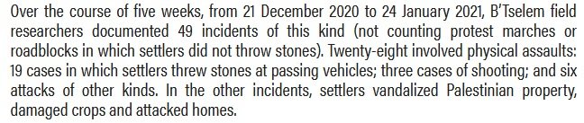 https://twitter.com/MairavZ/status/1372679709620805633Let's look at those numbers. Previously, Btselem claimed that between Dec 21 and Jan 24 (34 days) they counted 49 attacks, which means that in the remaining period until Mar 13 (48 days) they counted 45 more. In statistical terms, that's a 35% decline, certainly not a "surge". /2