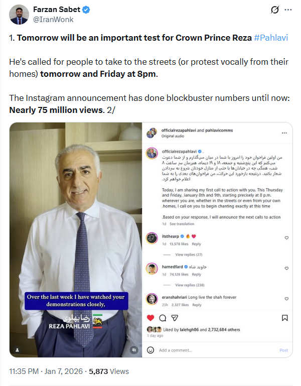 https://x.com/IranWonk/status/20084962909347681181. Tomorrow will be an important test for Crown Prince Reza #Pahlavi