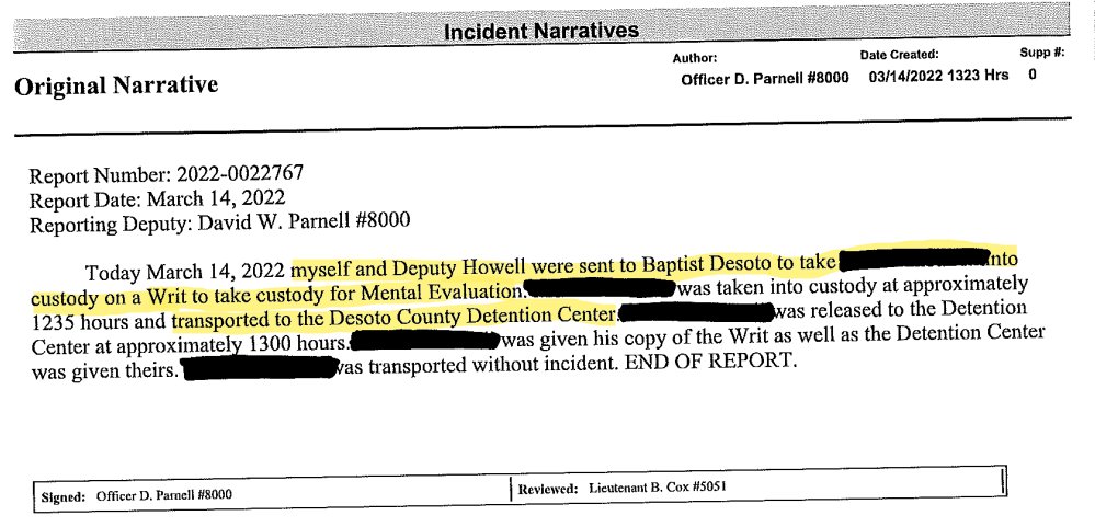 It was not an accident or a mistake: At the biggest hospital in Mississippi’s DeSoto County, south of Memphis, patients are sometimes jailed to await mental health treatment, according to sheriff’s department call logs, incident reports and jail dockets.