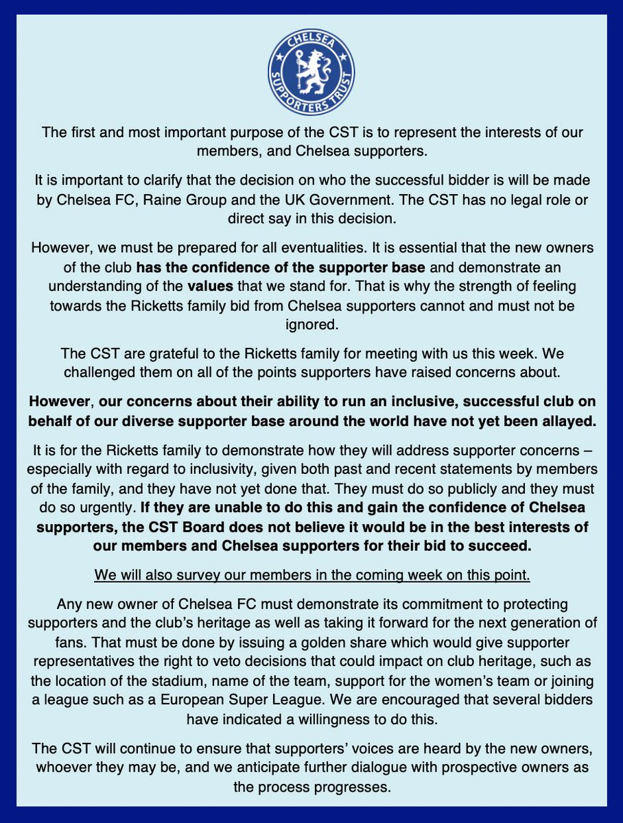 Chelsea Supporters’ Trust statement re Ricketts bid: "The CST are grateful to the Ricketts family for meeting with us. However, our concerns about their ability to run an inclusive club on behalf of our diverse supporter base around the world have not yet been allayed."