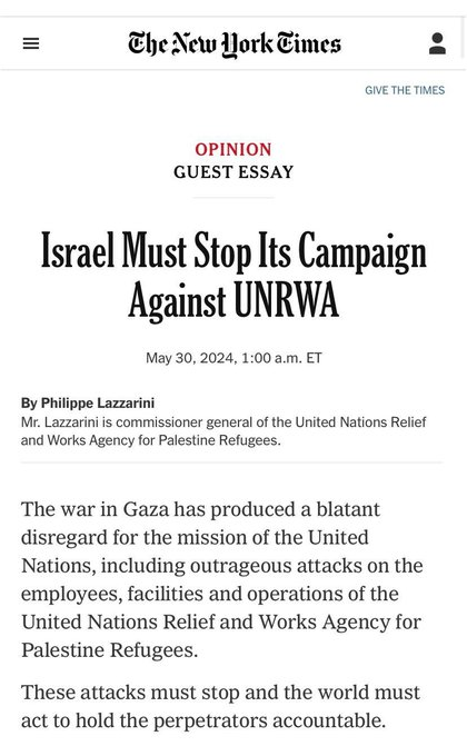 The head of UNWRA wrote a guest essay in the @nytimes saying that Israel must stop its campaign against UNWRA, calling the attacks against the organization "outrageous"